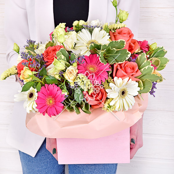Розовая гербера  означает пожелание счастья , белая – здоровья и благополучия, оранжевая роза символизирует очарование,  роза желтая кустовая –восхищение,  белая  эустома – признается в искренних чувствах , белая  гвоздика – это пожелание удачи и успеха во всем, а желтая статица  расскажет получательнице о том, что для того, кто дарит эти цветы она незабываема!