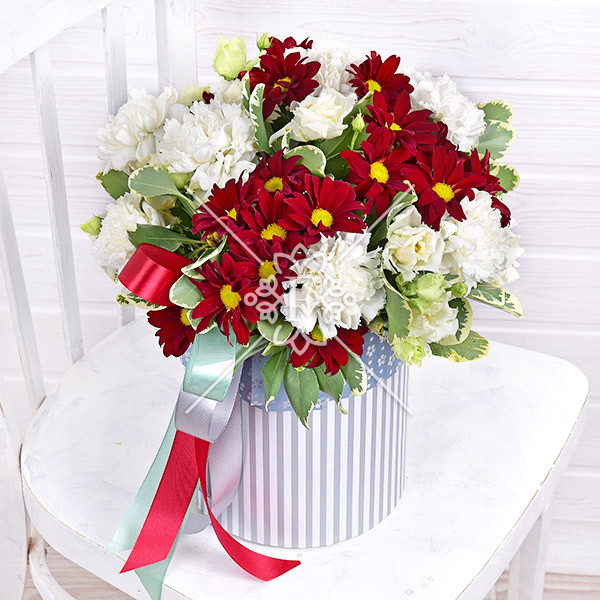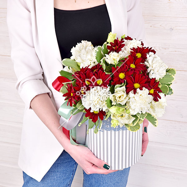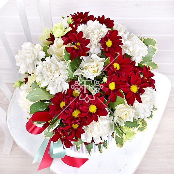 гвоздика белая – 11 шт., хризантема красная кустовая – 3 шт., эустома белая – 3 шт., зелень декоративная: питтоспорум, оазис, коробка, лента.
