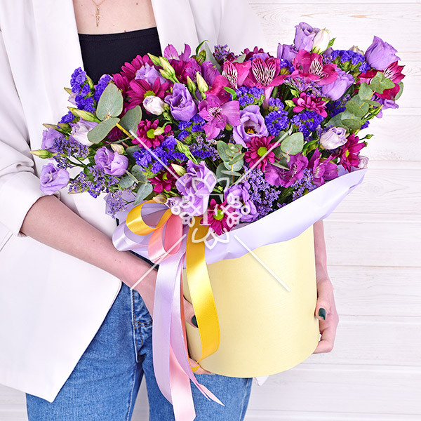 эустома фиолетовая – 5 шт., альстромерия фиолетовая – 2 шт., хризантема кустовая фиолетовая  - 2 шт., статица фиолетовая – 3 шт., декоративная зелень (эвкалипт, лимониум фиолетовый), оазис, коробка, лента.