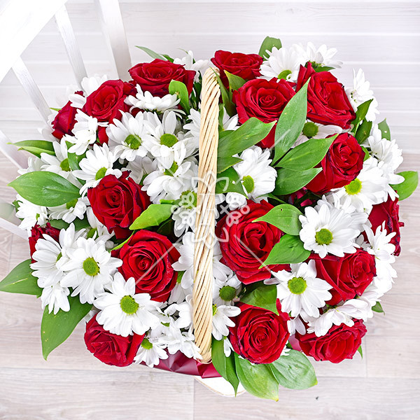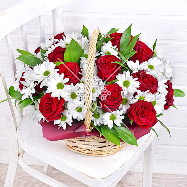 Романтика чувств – корзина с красными розами и белыми хризантемами